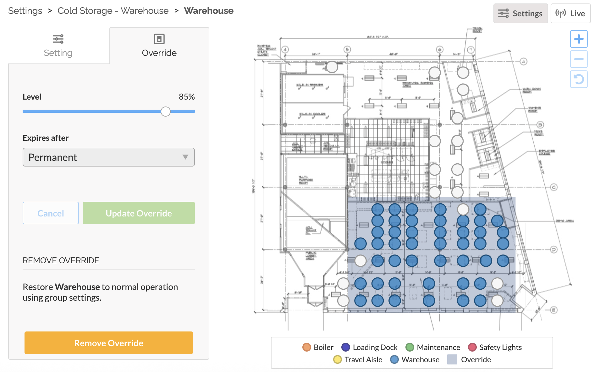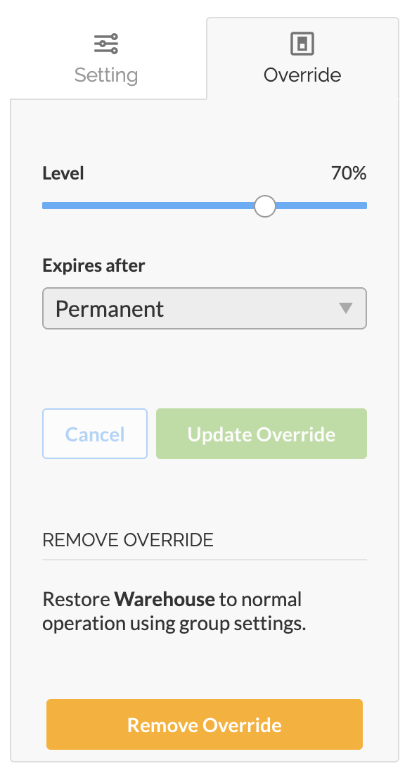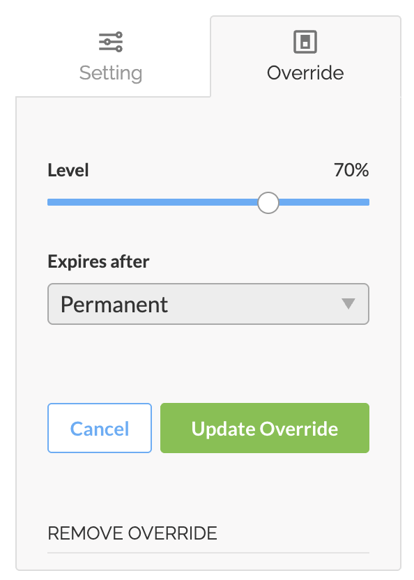 - Use the Level slider to select the desired light level, then select the duration of the override (between 1 - 24 hours, or permanent until removed).
