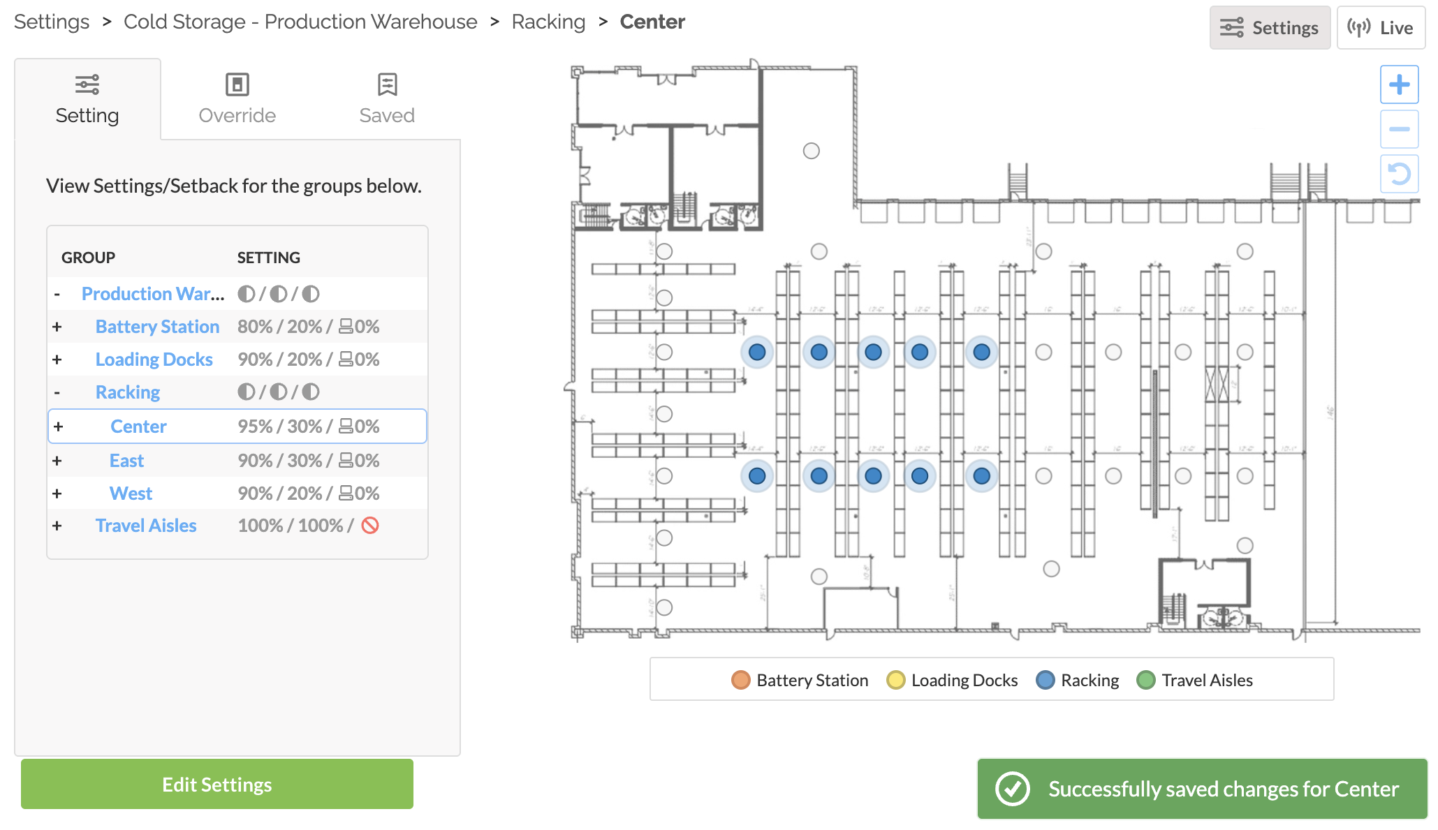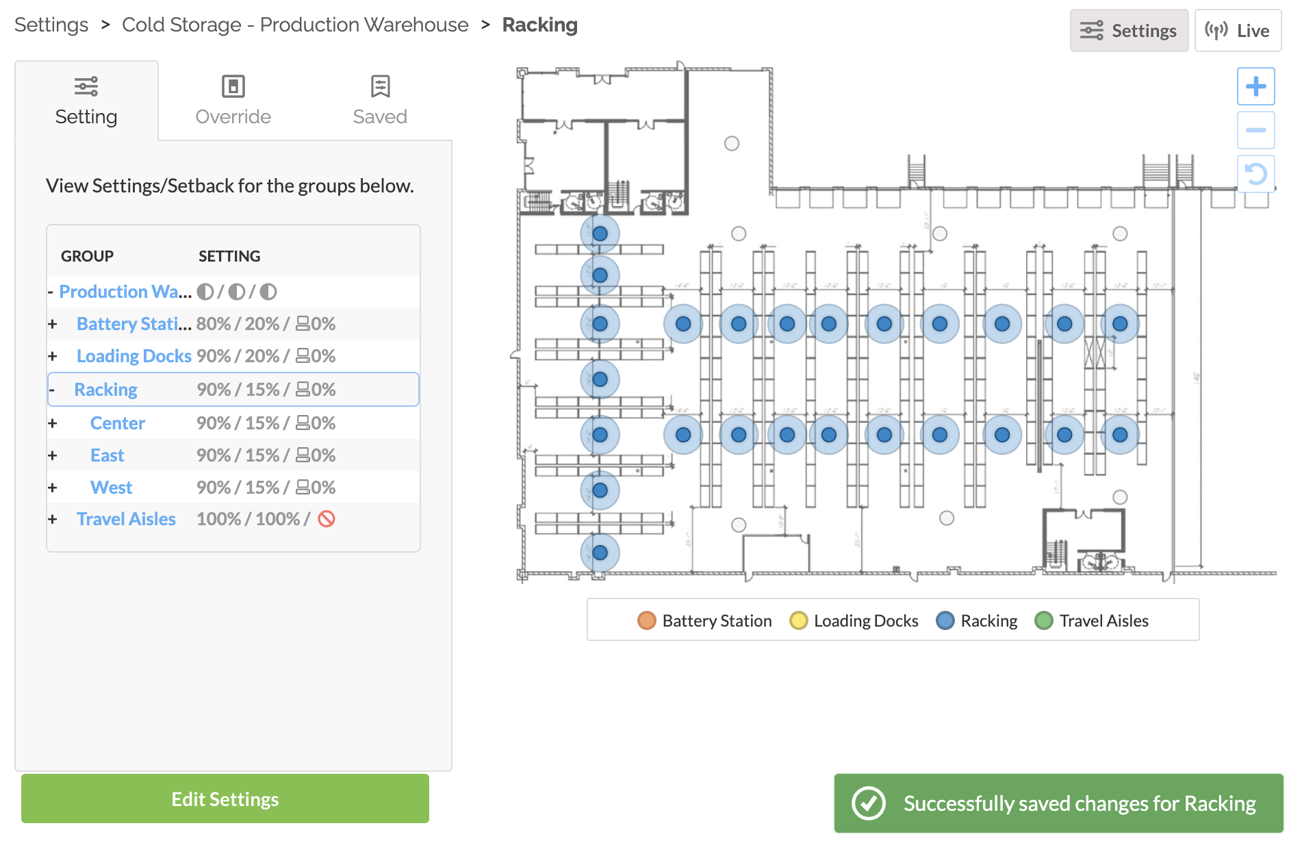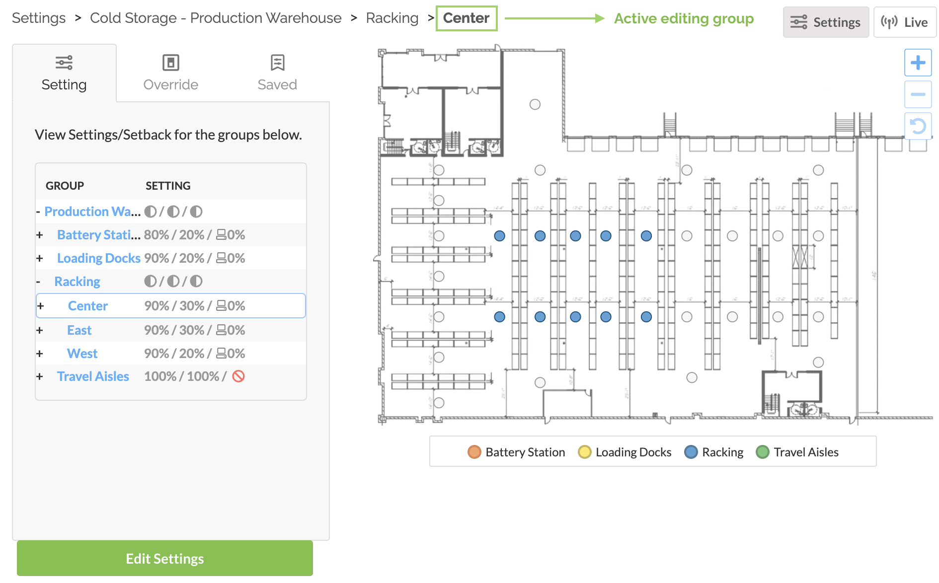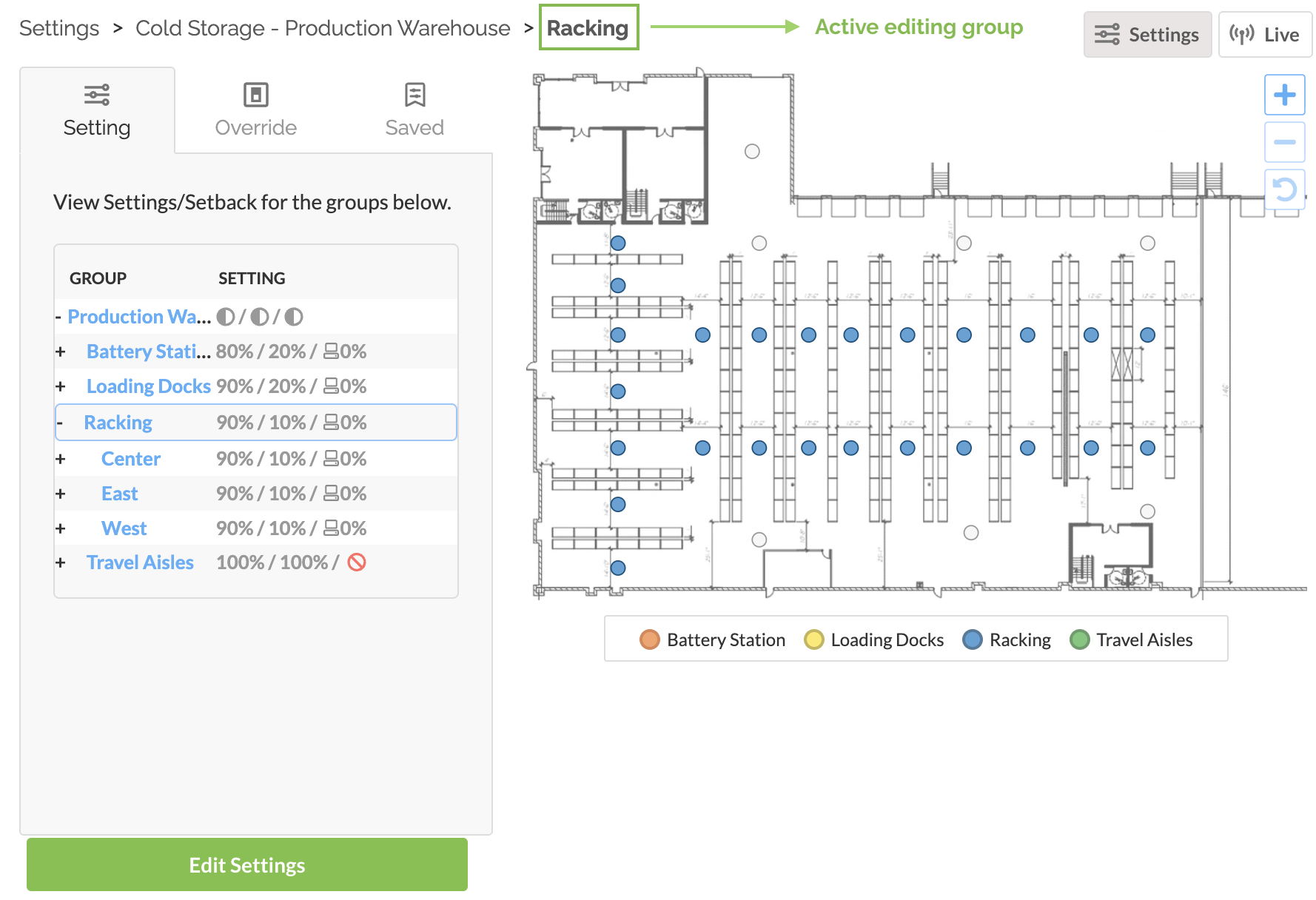 In this example, Parent group "Racking" is selected, and applied setting changes will be passed down to Child groups "Center", "East", and "West".