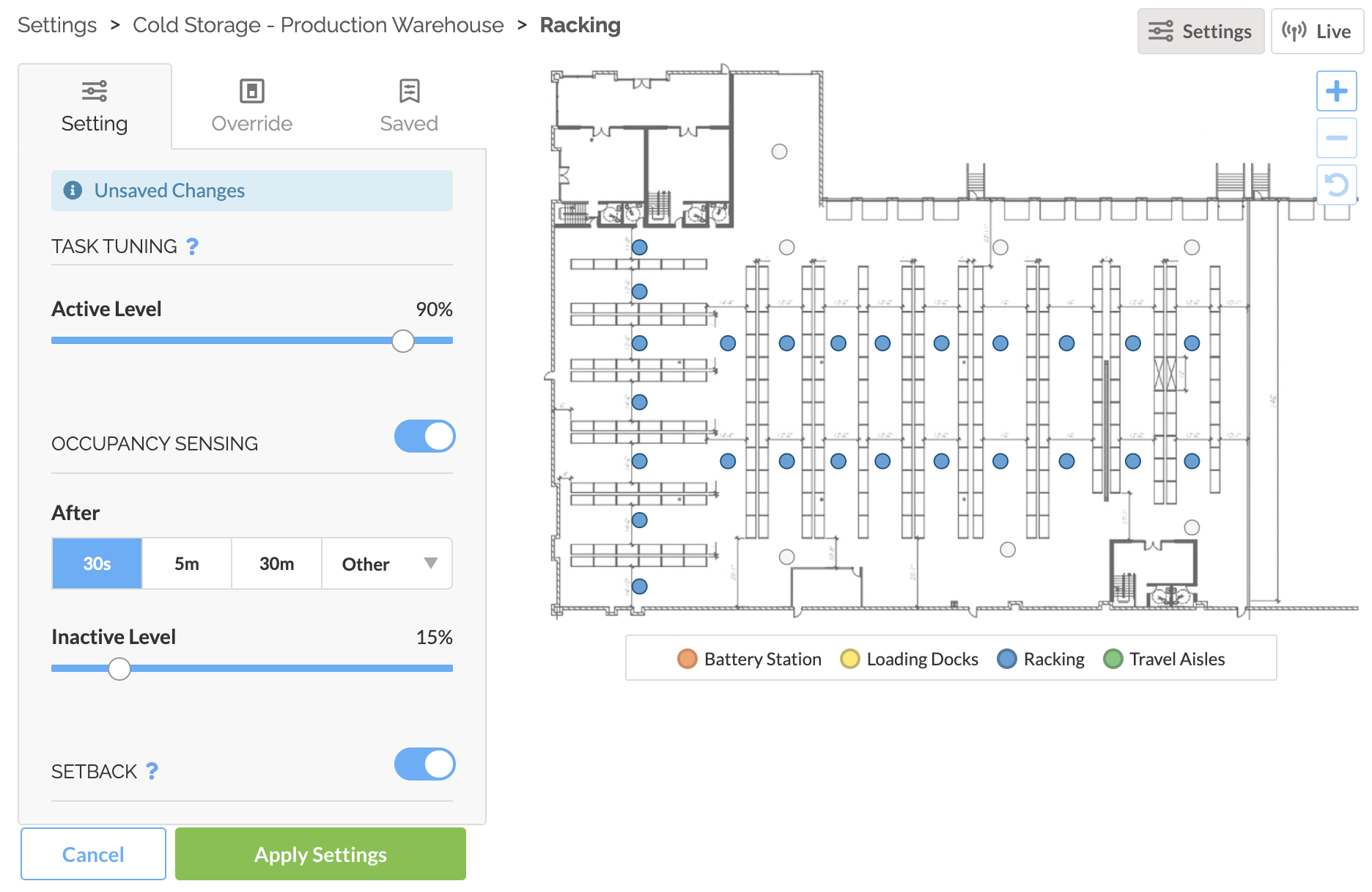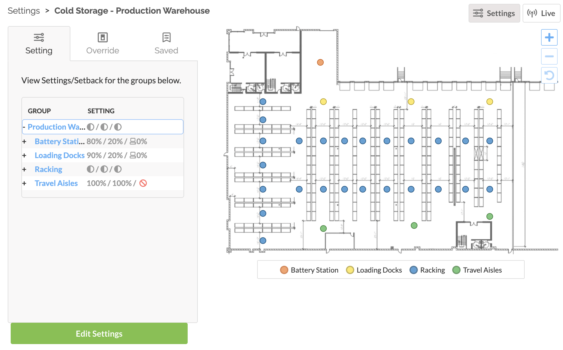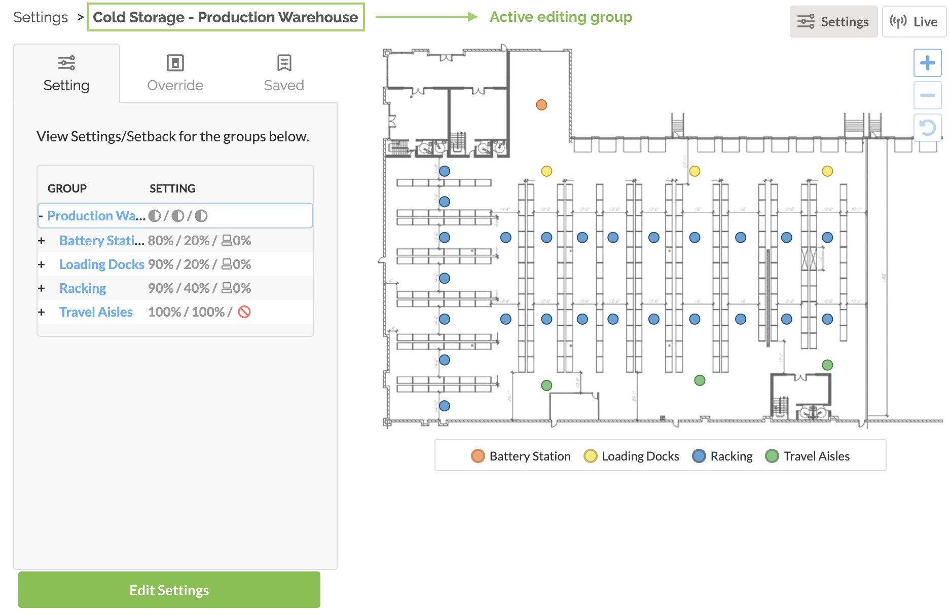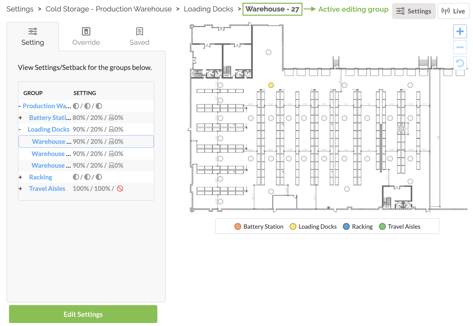 In this example, Parent group "Racking" is selected, and applied setting changes will be passed down to Child groups "Center", "East", and "West".