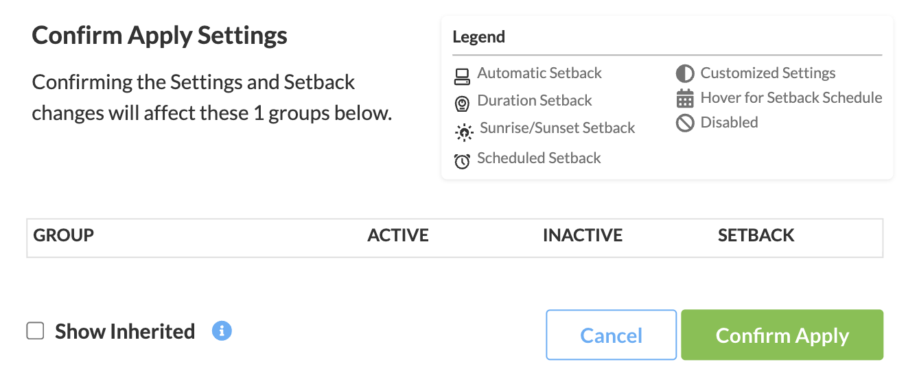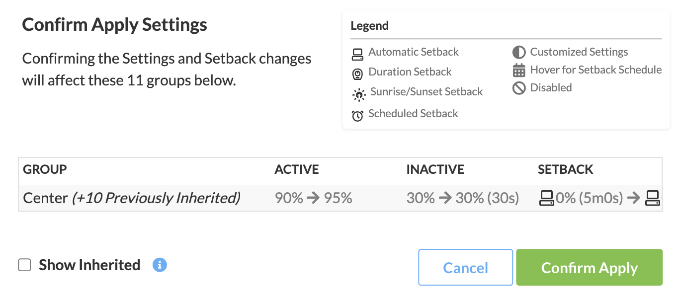 In this example, the Inactive level has been increased from 10% to 15%. The applied setting change will be passed down to Child groups "Center", "East", and "West". By toggling Show Inherited, you will see the Child groups that will inherit the applied changes.