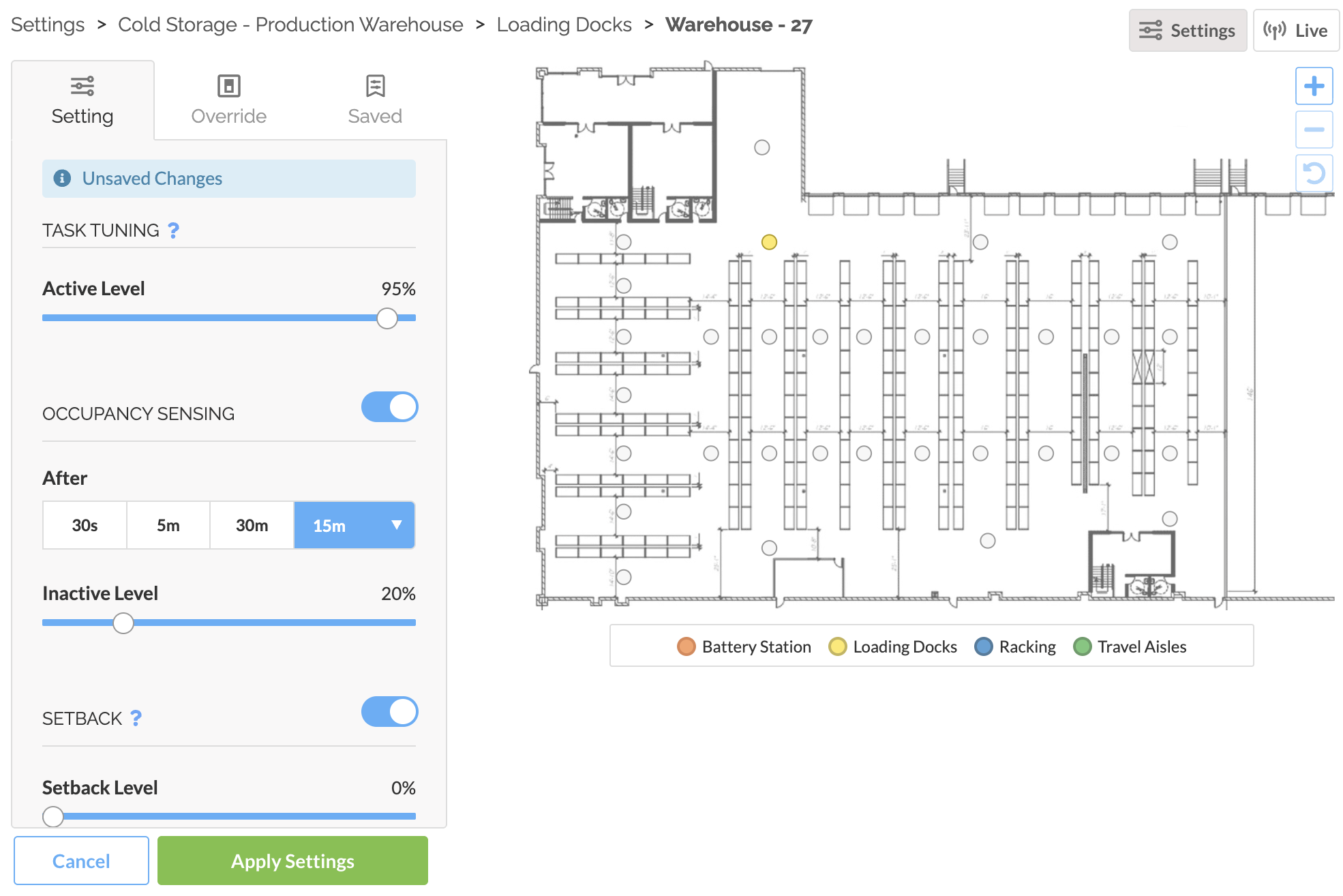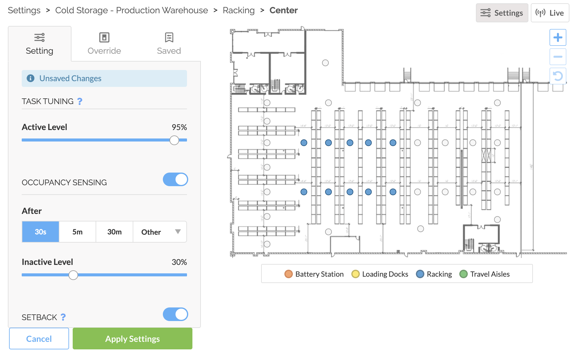 In this example, the Active level has been increased from 90% to 95%. The applied setting change will apply only to Child group "Center". By toggling Show Inherited, you will see the lights that will inherit the applied changes.