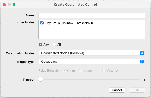 - Select whether the coordinated control should be activated by Any one of the Trigger Groups, or if All Trigger Groups must be triggered before the coordinated control is activated