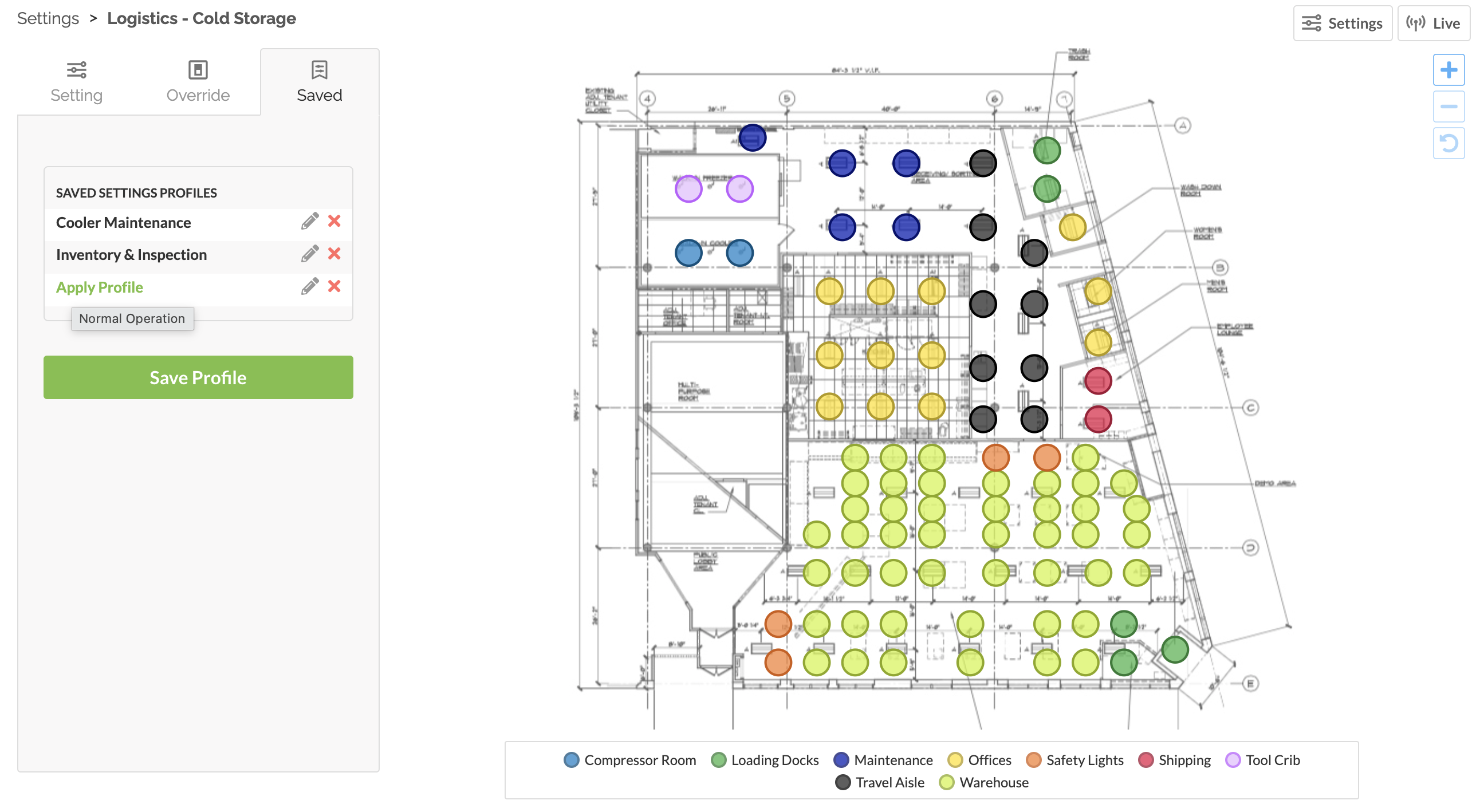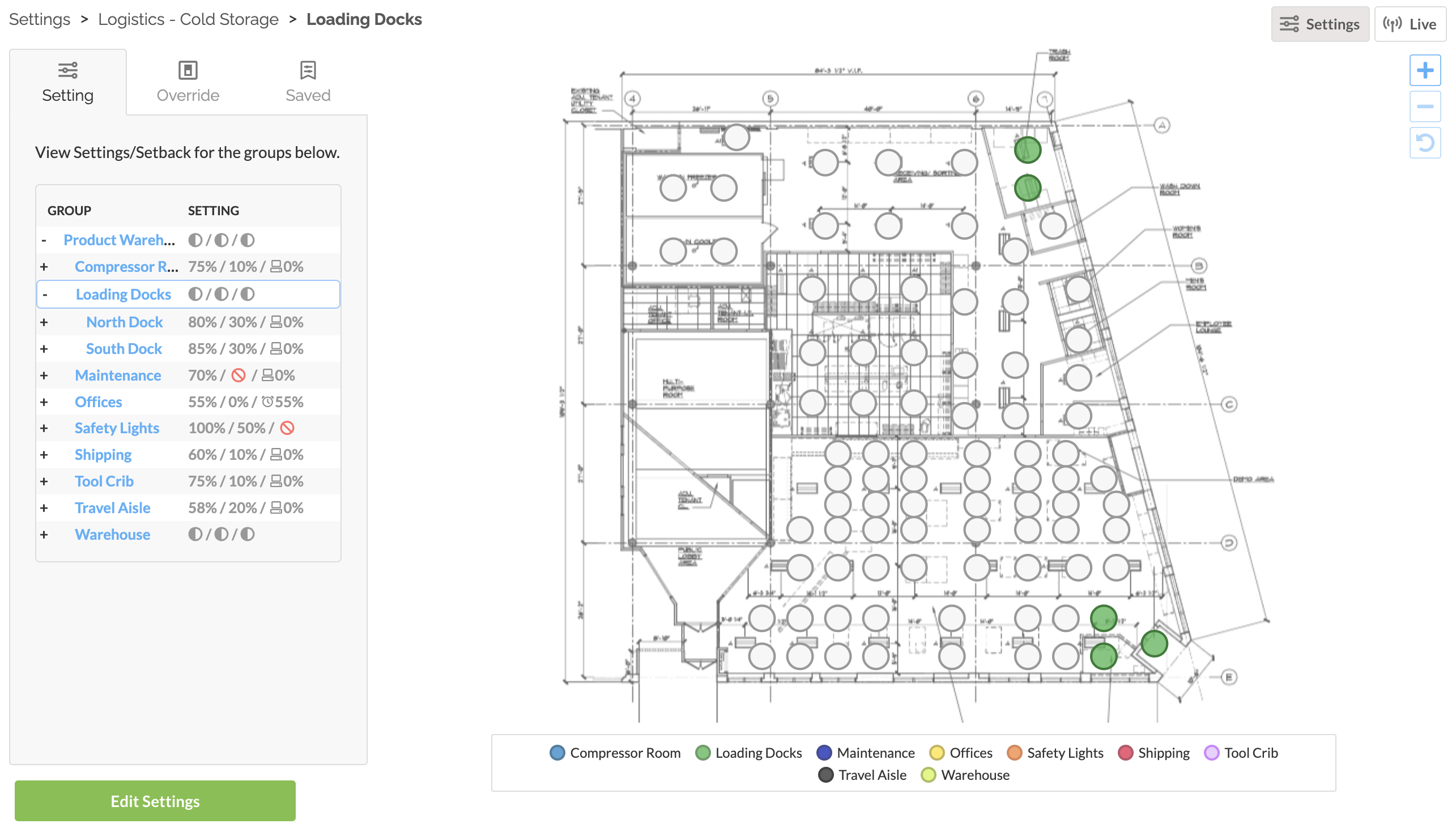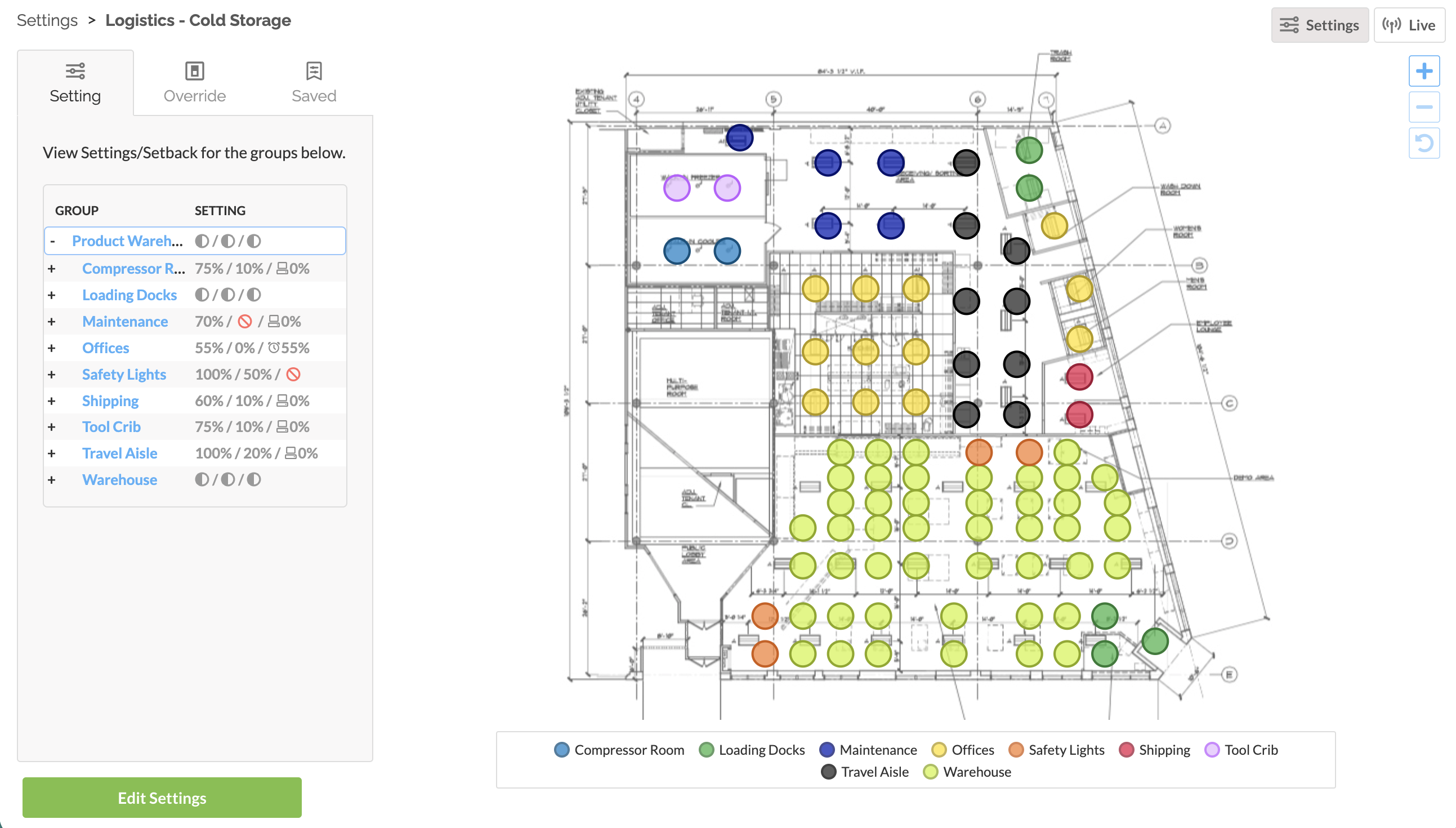 Each Area is organized into specific Groups, which are visually color-coded on your facility map for easy identification. You can choose to configure and save settings for the entire Area or drill down to a specific child group.