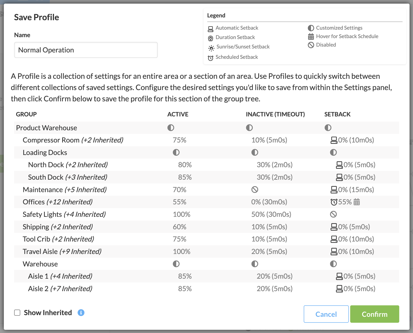 The parent of all groups in the Area is listed at the top of the Setting tab. For example when the Production Warehouse group is selected, a new Saved Settings Profile would include all lights in the Area .