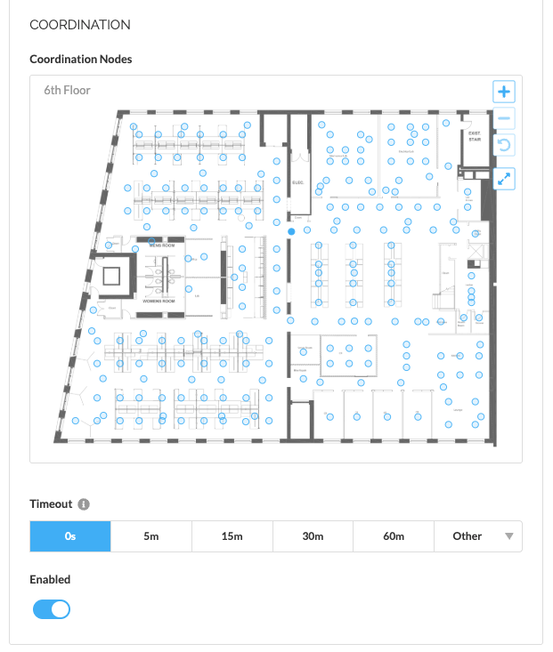 - After all Trigger Nodes do not detect occupancy for 10min (Coordinated Control Timeout), all nodes in the room dim to their inactive level (20%)